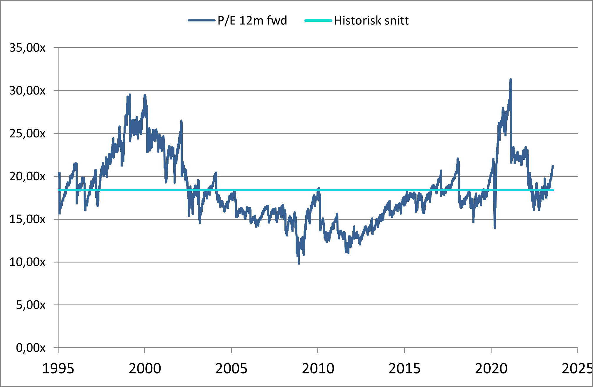 Amerikanske aksjer har steget 20% så langt i år (S&P 500 målt i US dollar). Den teknologitunge indeksen NASDAQ, er opp hele 42%. At aksjekursene til teknologi-selskapene stiger mye i en periode med raskt økende renter er uvanlig, men skyldes sannsynligvis i stor grad økt interesse for kunstig intelligens. Nå er sommeren snart på hell og høsten tar over, en tid hvor volatiliteten i aksjemarkedet historisk har vært høy. Aksjekursene har steget i 2023 uten at estimatene har blitt endret i nevneverdig grad, hvilket innebærer at inntjeningsmultiplene (aksjekurs/estimater) har steget.