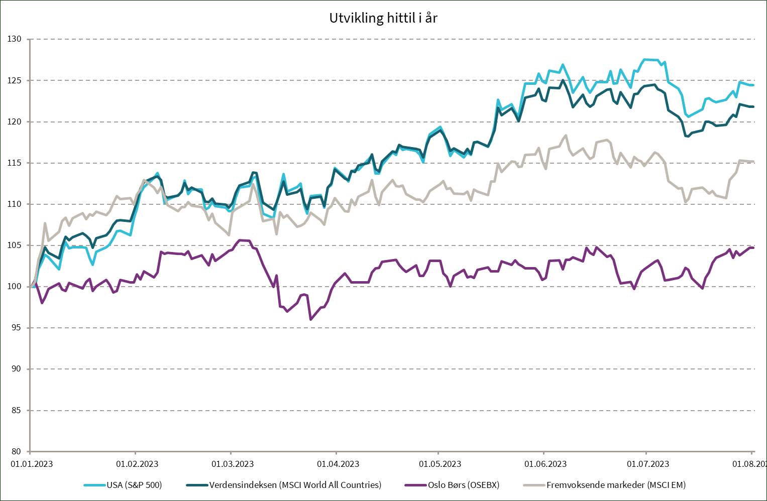 Det amerikanske aksjemarkedet er viktig og utgjør 69,4% av verdensindeksen MSCI World. Derfor følger vi nøye med på utviklingen i amerikansk økonomi. Akkurat nå opplever vi avvik mellom hvordan konsumentene og bedriftene oppfatter den økonomiske utviklingen i USA. Aksjemarkedet ser ut til å være enig med konsumentene og markedsoppgangen i år kan tilsi at investorer forventer en «myk landing» i amerikansk økonomi og ikke en resesjon. Men vi skal snart starte høsten, en periode som historisk har hatt store svingninger i aksjemarkedet. De neste ukene blir interessante etter hvert som vi får nye tall som viser utviklingen i inflasjonen og arbeidsmarkedet.