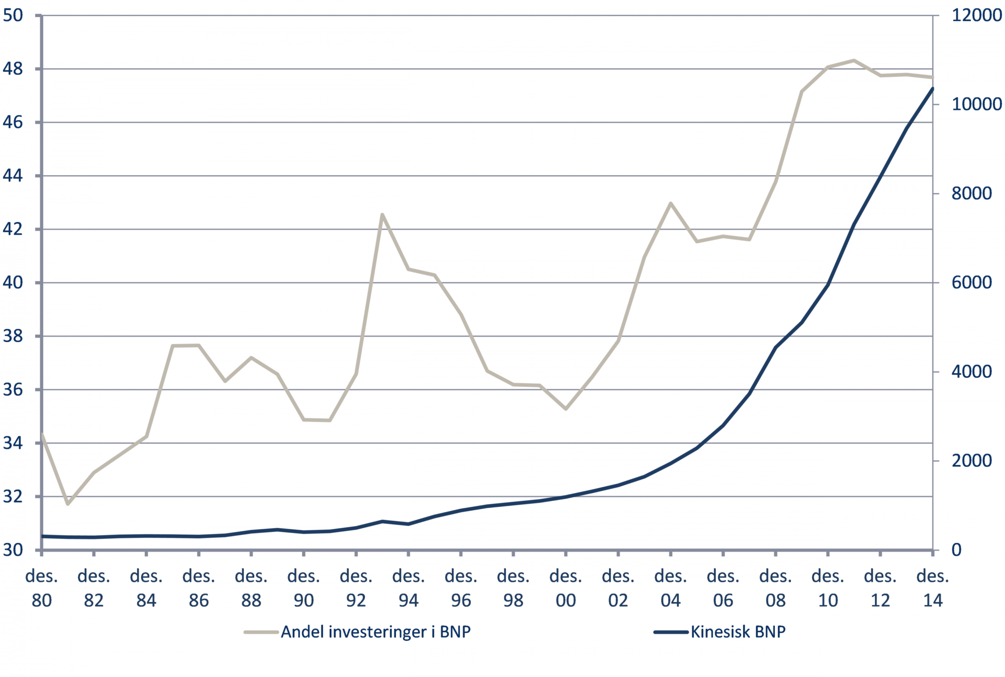 Normalt velinformerte kilder forteller om at det kinesiske lederskapet vil forsøke å restrukturere de delene av økonomien som baserer seg på produksjon og eiendomsutvikling. Investeringer i realkapital, i hovedsak veier og bygninger, har siden årtusenskiftet gått fra å utgjøre 36 prosent av BNP til 47 prosent. Når man i tillegg vet at den kinesiske økonomien har nærmere tidoblet seg i størrelse, skjønner man hvor stor hungeren etter alle slags innsatsfaktorer har vært.