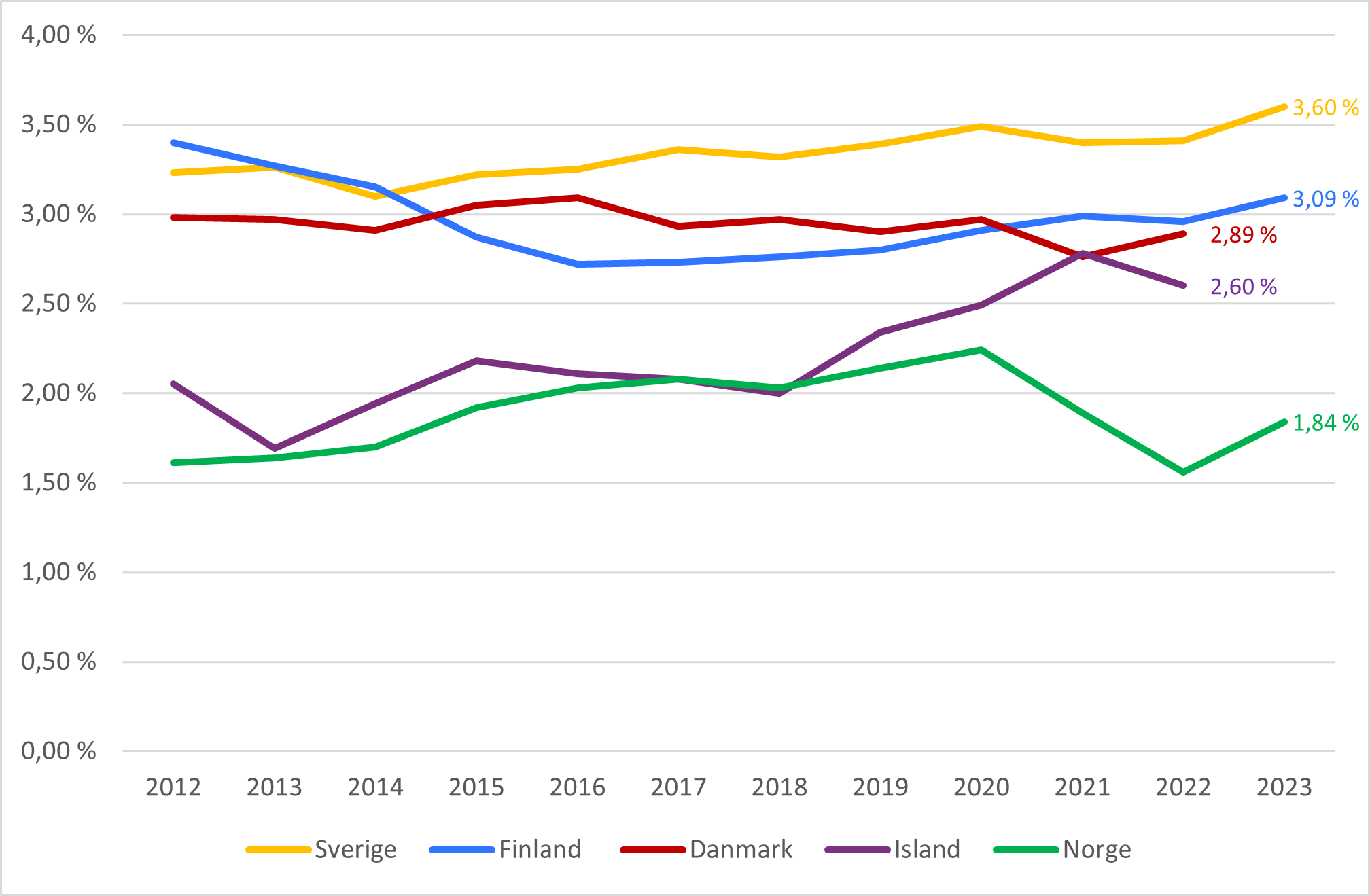 Figur 2 – Utgifter til FoU som andel av BNP i de nordiske landene 2012-2023
