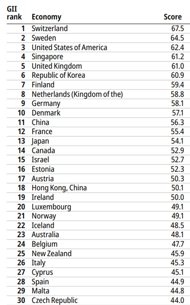 Figur 1 – Global Innovation Index 2024 – rangering over de mest innovative landene i verden