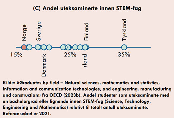 Norge har noe lavere gründer-aktivitet enn våre nordiske naboer og det kan skyldes at Norge har en stor offentlig sektor, og få sysselsatte innen teknologi- og kunnskapsintensive næringer hvor entreprenør-aktiviteten typisk er høyere. Det kan derfor være lurt at det satses mer på utdannelse innen realfag for å øke teknologikompetansen. Andel studenter som ble uteksaminert innen STEM-fag (Science, Technology, Engineering and Mathematics) i 2021 var veldig lav ifølge OECD.