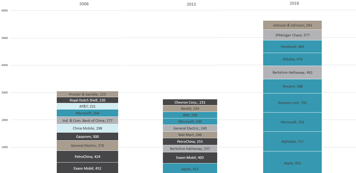 På mange måter minner situasjonen litt om slik verden ble oppfattet rundt årtusenskiftet. Også den gang utgjorde teknologitunge selskaper en stor del av verdens ti største selskaper, men den gang var det nettleverandører i stedet for innholdstjenester og Japan istedenfor Kina: